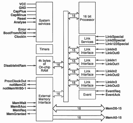 The IMS T222 transputer is a self contained computing engine, with RAM, CPU, timers and communications controllers all on the one chip. The only external requirements in this type of embedded system are a program ROM and a 5MHz clock.