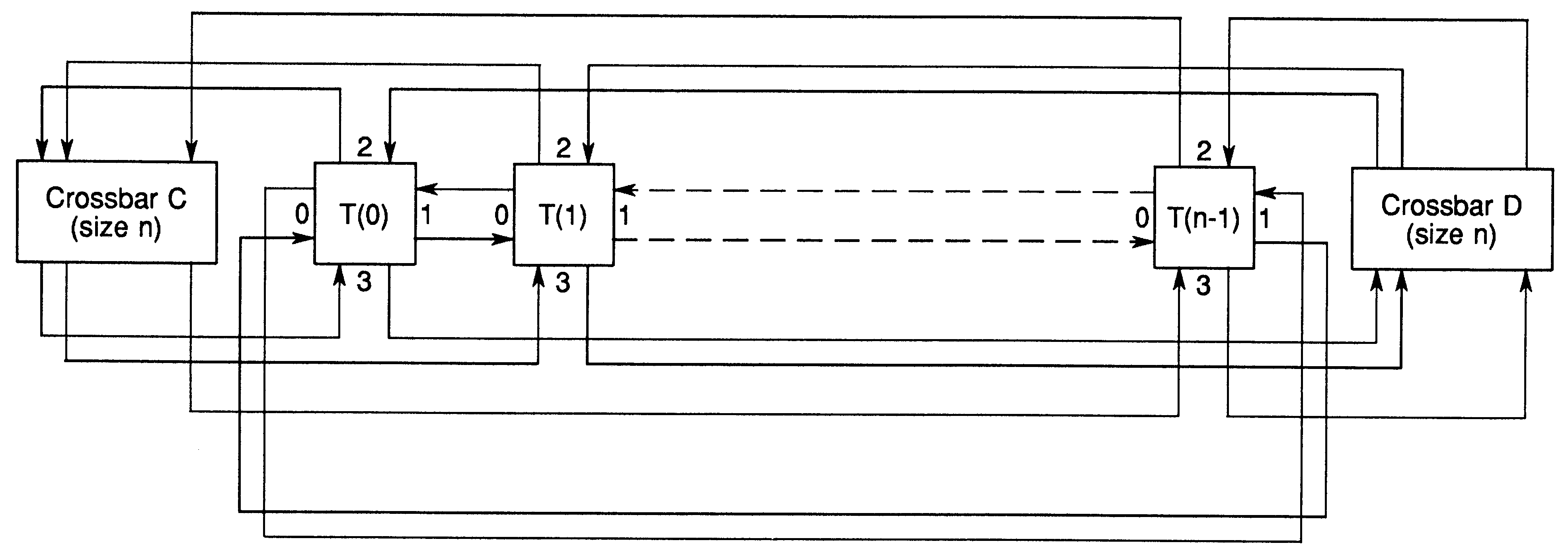 In the previous section, advantage was taken of the fact that all transputer links are identical. It will often also be true that all transputers in the network are identical. If this is the case then the Hamiltonian Cycle (if it exists) can be a fixed pipeline through the network. This means that the link 0 to link 1 connections can be hardwired and all possible configurations can be obtained by connecting link 2 to link 3 using two crossbars as described above. A network of N transputers could then be configured using just two N-way crossbars. This arrangement is shown in figure 16.