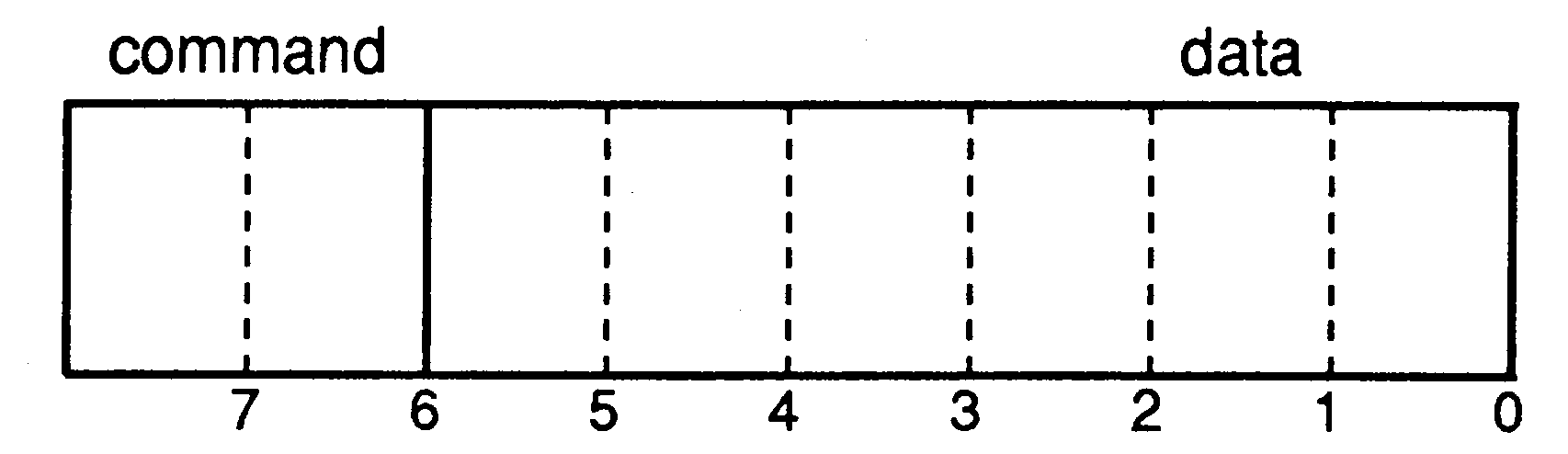 The commands are applied using an operand word as a parameter to the command. The value in the operand word is created by OR’ing in the bottom six bits of information from the command byte into the bottom six bits of the operand word. One of the four command values allows this to be repeated by shifting the value in the operand word six places ready to receive another six bits. The command bytes are thus encoded from two components:
