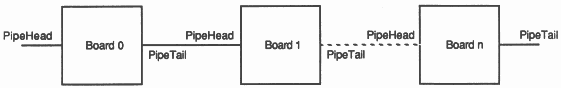 All the modules on a motherboard are connected in a pipeline as shown in Figure 1. Link 2 of the module in slot 0 is connected to link 1 of slot 1 and so on for the rest of the pipeline. Link 1 of module slot 0 (Pipehead) and link 2 of the last module slot (Pipetail) are brought out to an edge connector thus enabling the pipelines of any number of boards to be chained together by connecting Pipehead of one board to Pipetail of the next. See Figure 2.
