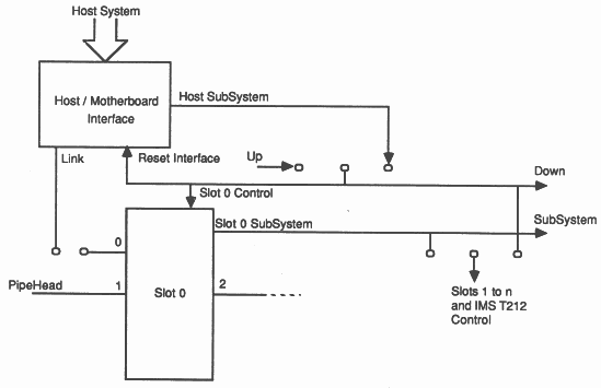 The host system accesses the module pipeline via Slot 0 Link 0, as shown in Figure 14. It is beyond the scope of this document to define the implementation of the host to link interface, but it might consist of an INMOS link adapter, the registers of which may be mapped into the host’s address space, or it may involve the use of dual-ported RAM shared between the host and a transputer.