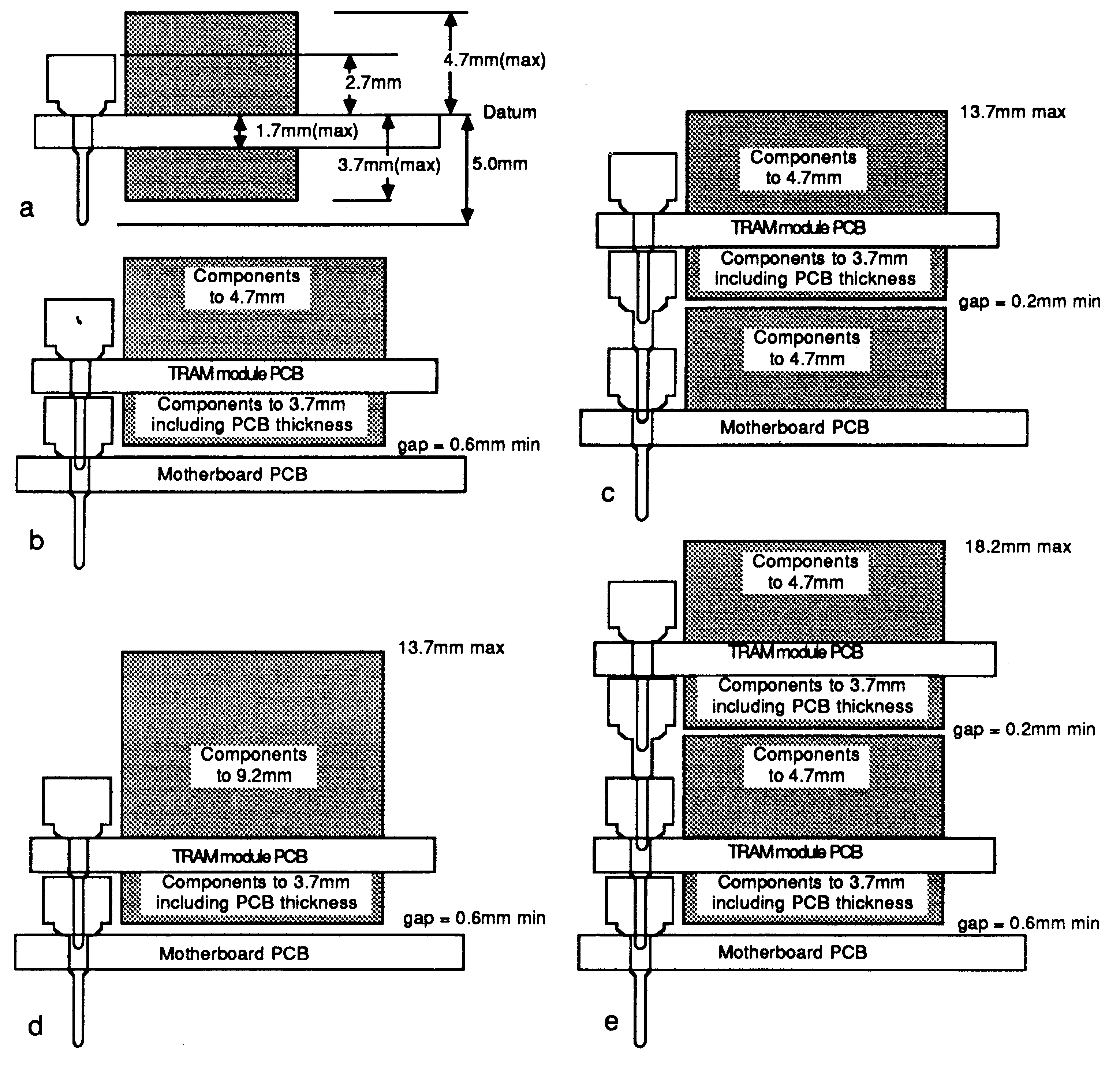 To provide the spacing shown in Figure 16c, the TRAM pins are implemented as a stackable socket, and an extra stackable socket is used between the motherboard socket and module pin.