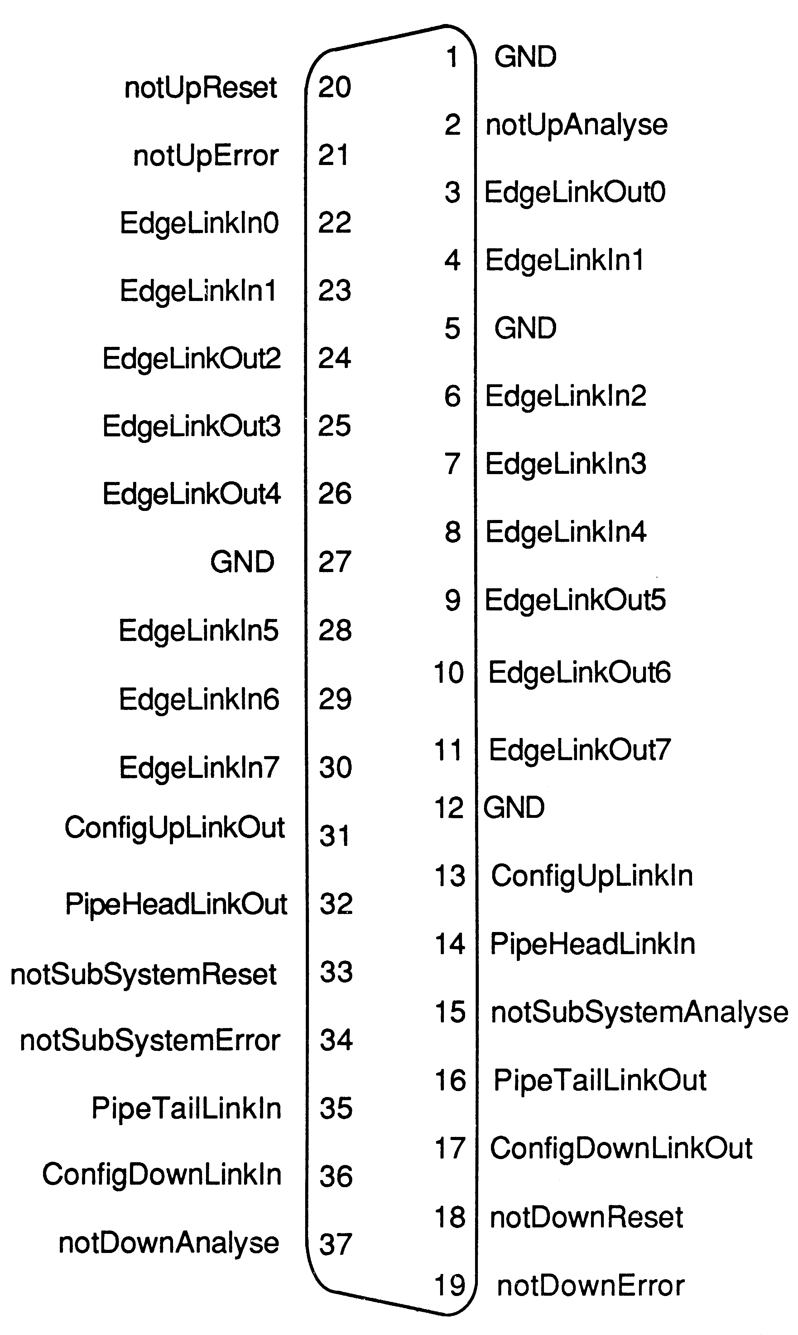 This connector provides up to twelve links (including ConfigUp, ConfigDown, PipeHead and PipeTail), plus Up, Down and Subsystem ports. A cable suitable for connecting IMS B008s together is shown diagrammatically in Figure 20.