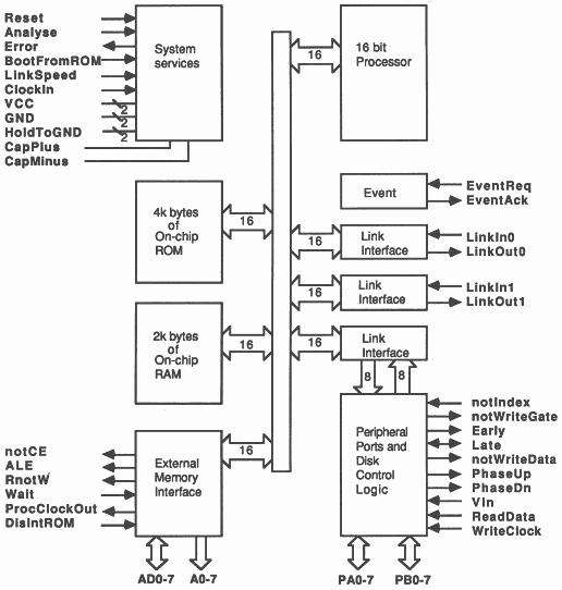 The IMS M212 also includes two 20 MHz INMOS serial links, 2 Kbytes of RAM, 4 Kbytes of ROM and an external memory interface which can be used to extend the total memory available to 64 Kbytes. The on-chip ROM contains software to allow the IMS M212 to be used as a stand-alone disk controller, with commands and data being transferred across the serial links. Alternatively, the internal ROM can be disabled and the disk processor programmed in a high level language.