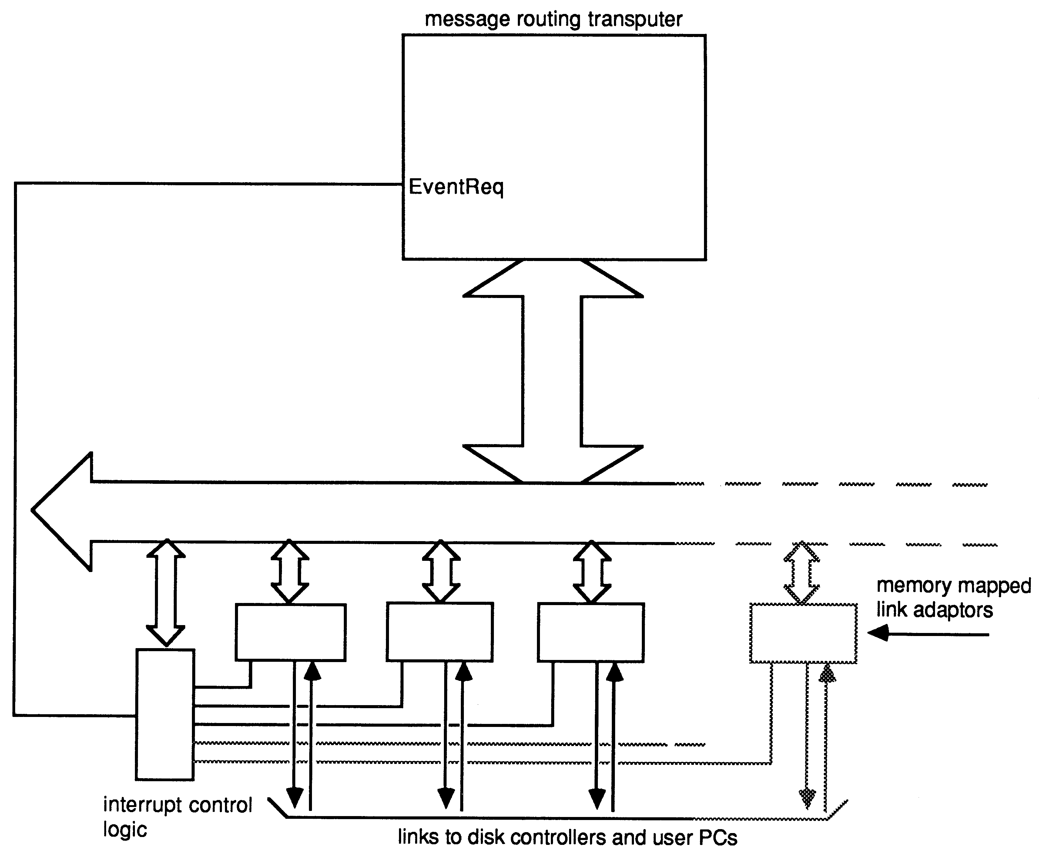 An alternative and more cost effective implementation is to have a single transputer to provide all message routing facilities and move the disk control code onto the IMS M212. The central routing processor would have to be a 32 bit device (e.g. an IMS T414) in order to provide the required amounts of memory. It would also require more than the 4 links on the transputer so a number of link adaptors would be memory mapped to provide a number of ’virtual’ links. These virtual links could be used very nearly as efficiently as the internal links if the interrupt outputs are connected, via an interrupt controller, to the EventReq pin of the transputer. The EventReq acts like an interrupt to the transputer but appears to the programmer simply as a channel input. This makes event handlers on the transputer very easy to implement and test, as they are exactly the same as any other piece of code. After receiving the event input, the transputer would read the number of the link adaptor generating the interrupt and then simply transfer the data. An outline of this scheme is shown in Figure 12.