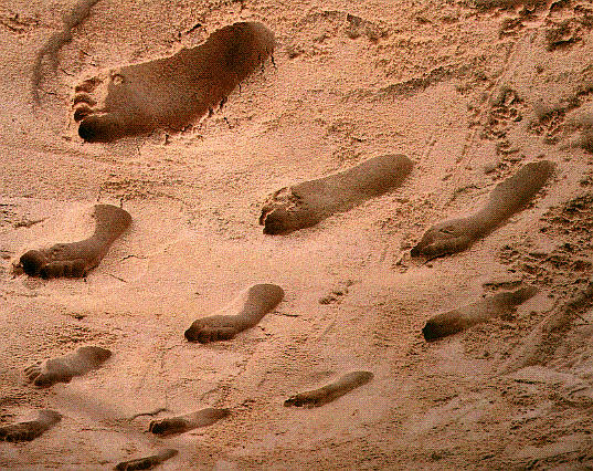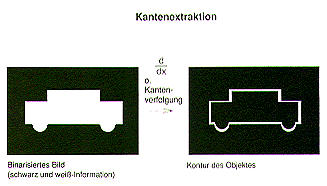 Der dritte Schritt umfaßt die Herausarbeitung der Kanten. Hier wird die Ableitung gebildet nach den Koordinaten in der Bildebene. Dort, wo eine Änderung der Helligkeit eintritt, wird ein weißer Bildpunkt, dort, wo keine Änderung der Helligkeit vorliegt, ein schwarzer Bildpunkt gesetzt.
