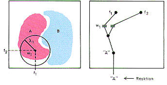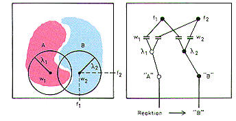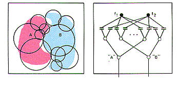 Den Eigenschaftsraum (links) der Objekte `A´ und `B´ findet man hier in zweidimensionaler Darstellung. Im Fall realer Objekte ist der Merkmalsvektor ein hochdimensionales Gebilde. Fällt ein Merkmalsvektor f = (f1, f2) in das Gebiet `A´, so muß das Ausgangsneuron (im Output-Layer) aktiv sein. Der gelernte Gewichtungsvektor w1 = (f1, f2) ist im Merkmalsraum eingetragen. Fällt in Zukunft ein Merkmalsvektor innerhalb des Kreises mit dem Radius lambda1 um f1, f2, erkennt das Netzwerk das Objekt `A´. Der Lernvorgang (rechts) hat ein Neuron der Zwischenschicht und ein Neuron der Ausgangsschicht erzeugt. Der Gewichtsvektor w1 entspricht dem Merkmalsvektor und wird im Verlauf des Lernens nicht korrigiert.