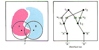 Eine kritische Situation: Der Merkmalsvektor f führt zu einem Konflikt, da er sowohl im Einzugsbereich des Zwischenschichtneurons 1 als auch in dem des -neurons 2 liegt; beide Ausgangsneuronen, sowohl für `A´ als auch `B´, sprechen an. Die Lösung der Konfliktsituation geschieht durch eine Reduzierung des Einzugbereichs von lambda2, weil f näher an `B´ liegt. Dieser Konfliktlösungsstrategie über jeweils verbesserte Abgrenzung verdankt das Netzwerk seinen Namen: Restricted Coulomb Energy (RCE). Bei reduziertem Einzugsbereich lambda2 feuert nur noch das Neuron `A´ der Ausgangsschicht. Es war also nicht erforderlich, einen neuen Knoten im Netzwerk hinzuzufügen.