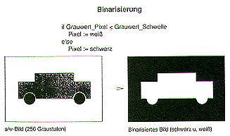Im zweiten Schritt erfolgt die Binarisierung des Bildes, das heißt, alle Graustufen unterhalb einer Schwelle werden zu weiß, alle oberhalb zu schwarz (oder umgekehrt) kodiert.