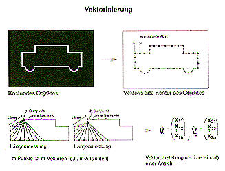 Zur Vektorisierung überzieht das Programm das Objekt mit einem Polygonzug aus äquidistanten Punkten. Von jedem Punkt des Polygonzuges aus wird der Abstand zu n folgenden Punkten des Polygonzuges gemessen. Man erhält so m Vektoren der Dimension n. Diese Vektoren heißen Merkmalsvektoren. Jeder Merkmalsvektor entspricht einer anderen Ansicht desselben Objekts.