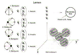 In der Lernphase des neuronalen Netzes wird entsprechend der Nestor-Philosophie des RCE-Netzes (Restricted Coulomb Energy) jeder Ansicht ein Zwischenneuron zugewiesen, wobei die verschiedenen Ansichten eines Gegenstandes (Objektes) mit dem gleichen Neuron der Ausgangsschicht verbunden sind. Jeder neue Gegenstand wird als neues Ausgangsneuron hinzugefügt. (In der Nestor-Terminologie werden Neuronen als Prototypen bezeichnet.) Sollten sich die Einzugsbereiche zweier Ansichten überlagern, sorgt die Kollisionsbehandlung des RCE-Netzwerks dafür, daß der Einzugsbereich der Ansichten entsprechend geändert wird. Dieses Modell erhält seine Drehungsinvarianz also durch die vorher gesammelte Vielzahl von Ansichten, von denen eine mit der aktuellen Ansicht übereinstimmen muß.