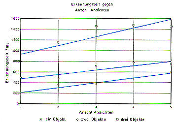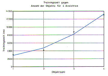 Als letztes Kriterium bleibt die Fehlerträchtigkeit des Systems. Bei diesem Experiment habe ich bei der Auswahl der zu lernenden Ansichten mit Vorsatz keinerlei Auswahlkriterien getroffen. Mit anderen Worten, die gelernten Positionen mußten rein zufällig gelernt werden. Bei sorgfältiger Auswahl zu lernender Positionen läßt sich der Lernerfolg verständlicherweise erhöhen. So aber werden viele ähnliche Ansichten mitgelernt, die den Lernerfolg herabsetzen. Es spricht für das beschriebene Lernverfahren, daß bereits nach rund 3 Ansichten (Aufnahmen) das neuronale Netz austrainiert ist und eine Fehlerquote von circa 20 % unterschreitet. Hauptfehlerquelle dieses Experiments war das Modell eines Wasserflugzeugs, welches wegen seines komplexen Umrisses gegenüber allen anderen Objekten erheblich größere Anforderungen an die Klassifizierungsfähigkeit des Systems stellte. Auch hier muß zur Entschuldigung des Systems gesagt werden, daß an den Default-Parametern keine Änderung vorgenommen wurde, was möglicherweise auch der Erkennung dieses komplexen Objektes zu einem besserem Ergebnis verholfen hätte.
