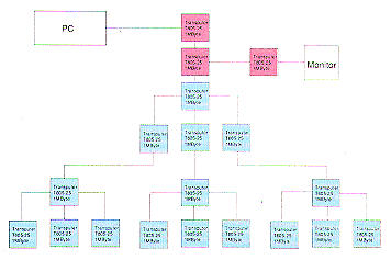 Die Beschreibung des Algorithmus (siehe Kasten `Stufen des Bilderkennungssystems´) macht deutlich, daß eine erhebliche Rechenleistung zur Verfügung stehen muß, soll eine Anwendung in Echtzeit ablaufen. Bei der Thema-Station hat man deshalb das baumartige (triadische) Netzwerk mit 16 Transputern realisiert. Leider ließ sich die uns zur Verfügung gestellte Konfiguration nicht variieren, das heißt, es war nicht möglich, die Anzahl der Transputertriaden nach Erstellung der Implementation zu verändern. (Nach Angaben des Herstellers erbrachte bei der OCR eine 1-Transputer-Station eine Erkennungsleistung von 20 Zeichen pro Sekunde, während eine mit 5 Transputern ausgestattete Version 90 Zeichen je Sekunde verifizierte.)