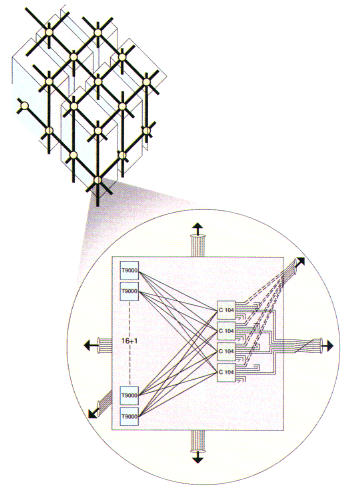 Die virtuellen 65 536 Verbindungsmöglichkeiten des T9000 werden durch Inmos-C104-Routing-Chips auf reale Links abgebildet. Durch den hohen Integrationsgrad von Scheduling-, Multiplexing- und Routing-Mechanismen auf dem Transputerknoten können beliebige Topologien für das Gesamtsystem verwirklicht werden. Die virtuelle Kommunikationsstruktur erleichtert die Skalierbarkeit des Parallelrechners und die Abstimmung von Rechen- und Kommunikationsleistung.
